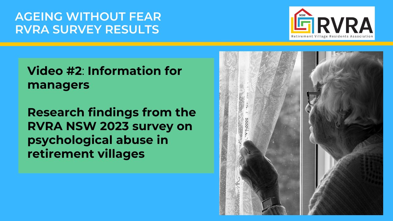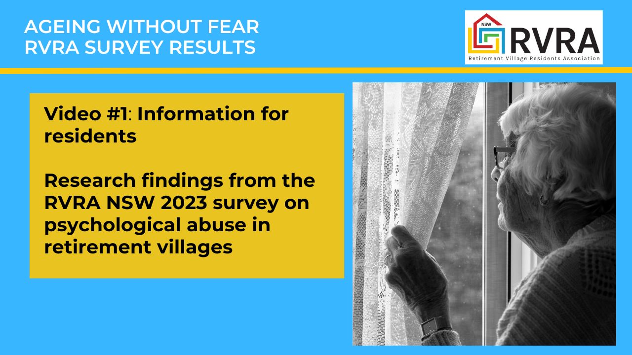 In 2023, the Retirement Village Residents Association (RVRA) developed and distributed a survey on psychological abuse to all its members and some 120 retirement villages throughout NSW.